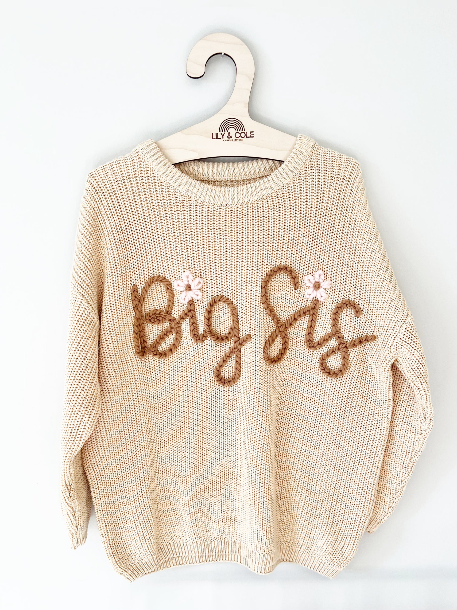 Indulge in warmth and style with our Cotton Sweater, personalized with the words "Big Sis". This knit is the perfect idea for a pregnancy or birth announcement and pairs perfectly with our "Lil Sis" matching sweater. Each sweater is a unique piece crafted for capturing special moments, celebrating occasions, or gifting someone who means the world to you. It's not just a sweater; it's a heartwarming, personalized keepsake that will be cherished for years to come.