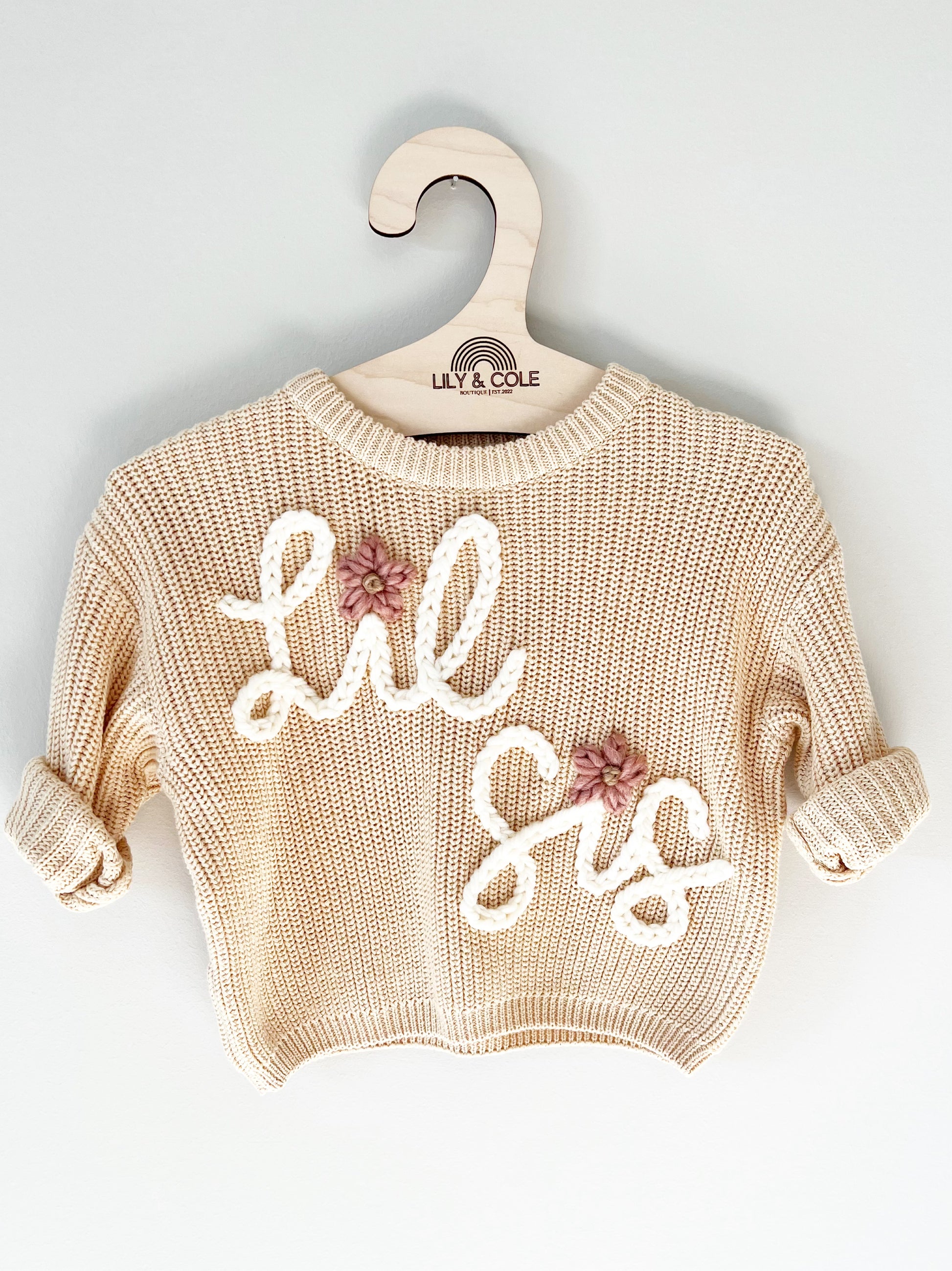 Indulge in warmth and style with our Cotton Sweater, personalized with the words "Lil Sis". This knit is the perfect idea for a pregnancy or birth announcement and pairs perfectly with our "Big Sis" matching sweater. Each sweater is a unique piece crafted for capturing special moments, celebrating occasions, or gifting someone who means the world to you. It's not just a sweater; it's a heartwarming, personalized keepsake that will be cherished for years to come.