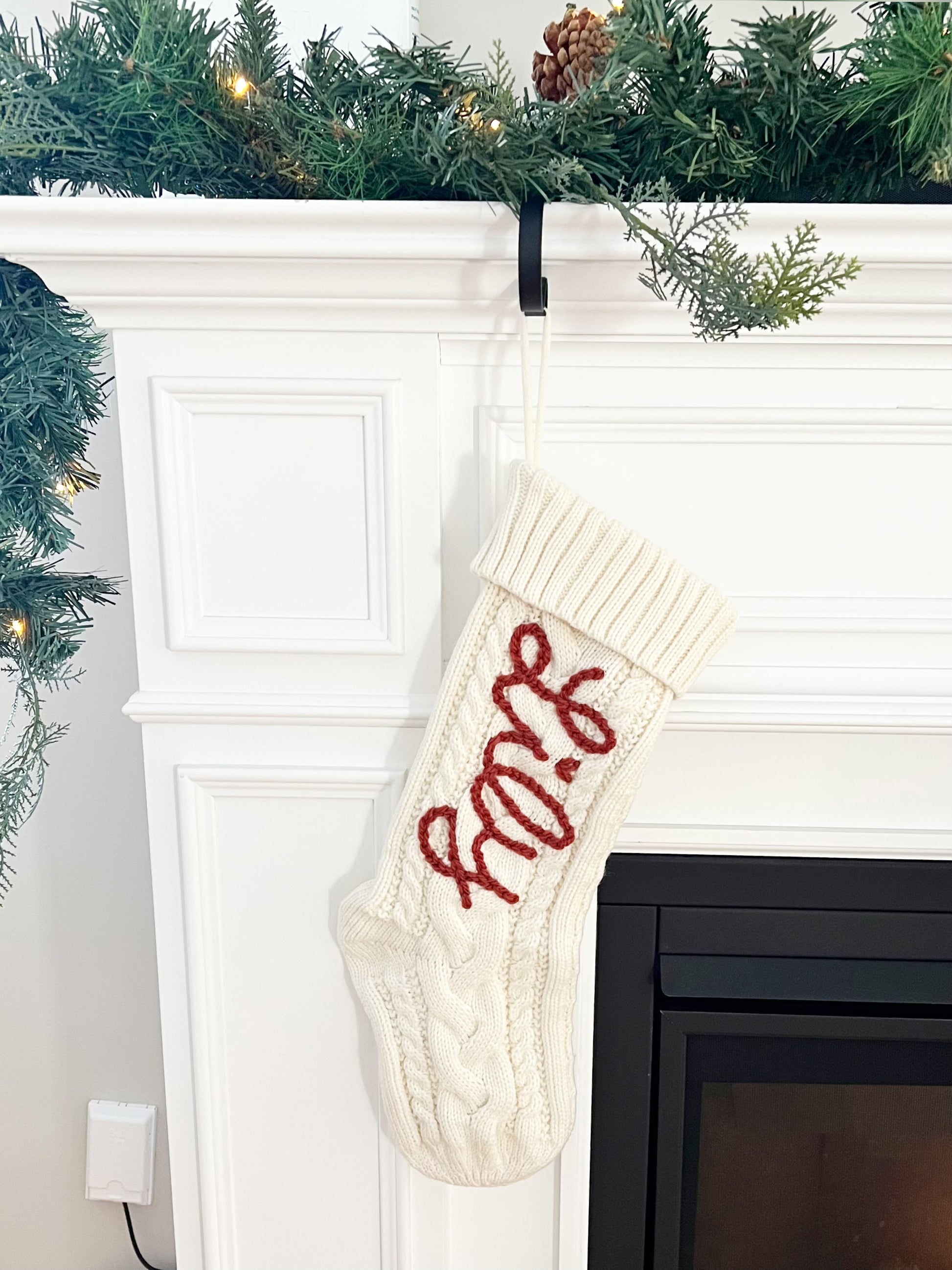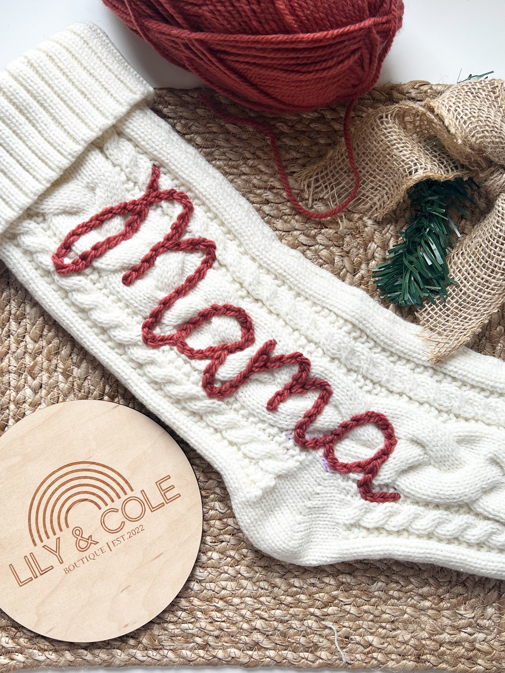 Embrace the enchantment of the holidays with our custom embroidered stocking. This timeless piece combines the warmth of a cozy knit with the pristine beauty of white, creating a festive accessory that effortlessly elevates your space.