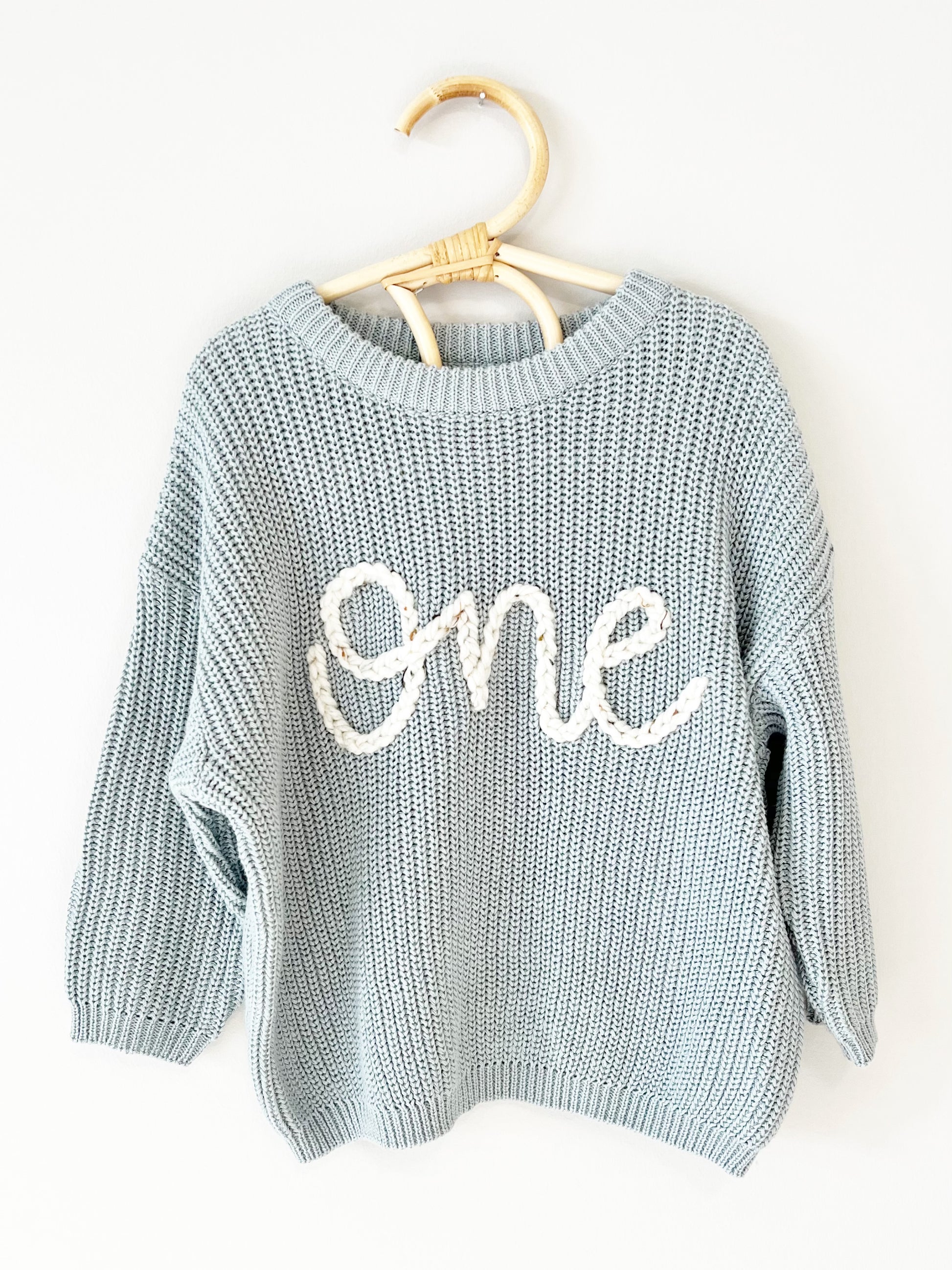 Indulge in warmth and style with our Cotton Sweater, personalized with the word "One". This knit is the perfect idea for a first birthday or milestone gift. Each sweater is a unique piece crafted for capturing special moments, celebrating occasions, or gifting someone who means the world to you. It's not just a sweater; it's a heartwarming, personalized keepsake that will be cherished for years to come.